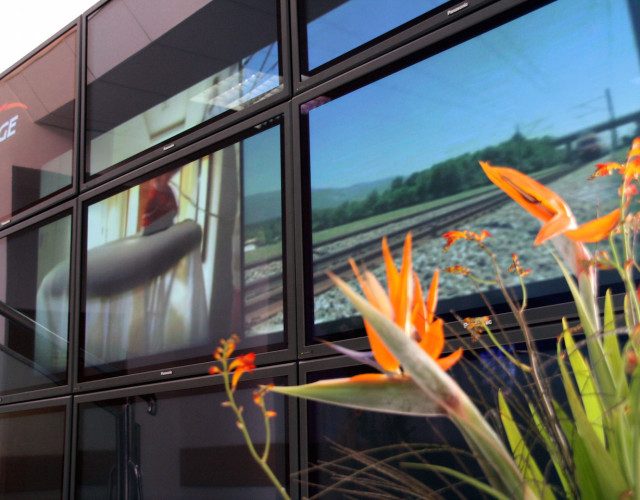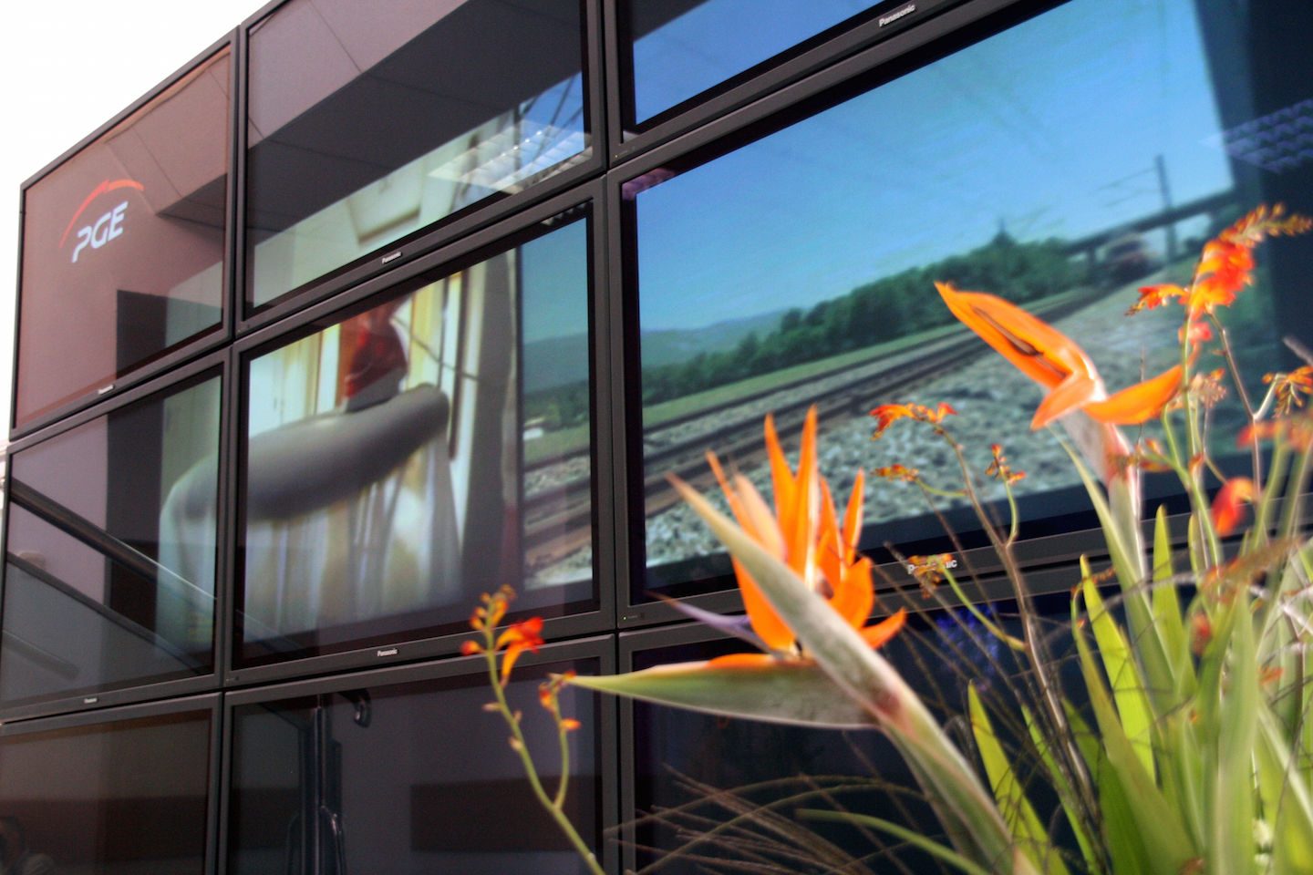 Zbudowaliśmy specjalną konstrukcję, na której zamontowaliśmy dziewięć profesjonalnych monitorów plazmowych PANASONIC. Powstała w ten sposób imponująca ściana wizualna, która stanowiła centralny punkt jubileuszu i prezentowała materiały historyczne oraz wizje przyszłości elektrowni.