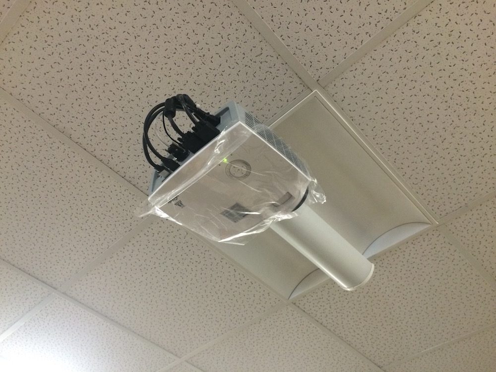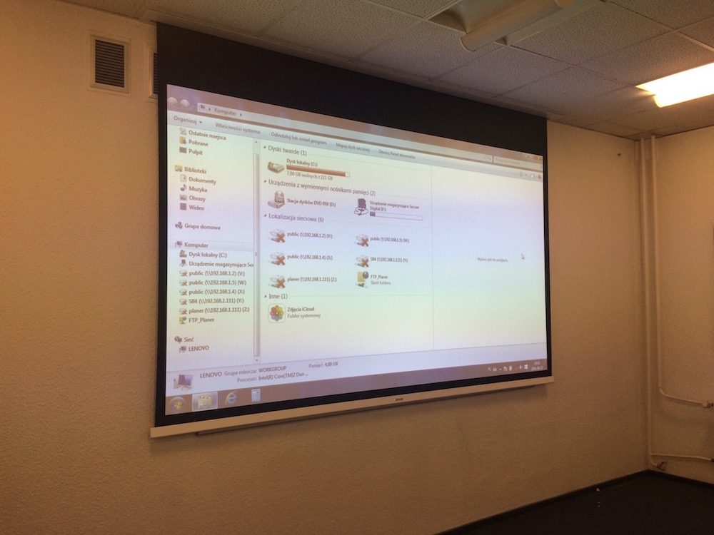 Montaż projektora multimedialnego z uchwytem sufitowym, instalacja ekranu projekcyjnego z napędem elektrycznym, wdrożenie systemu nagłośnienia z wzmacniaczem strefowym oraz instalacja mikrofonów konferencyjnych na stałe wbudowanych w stoły.