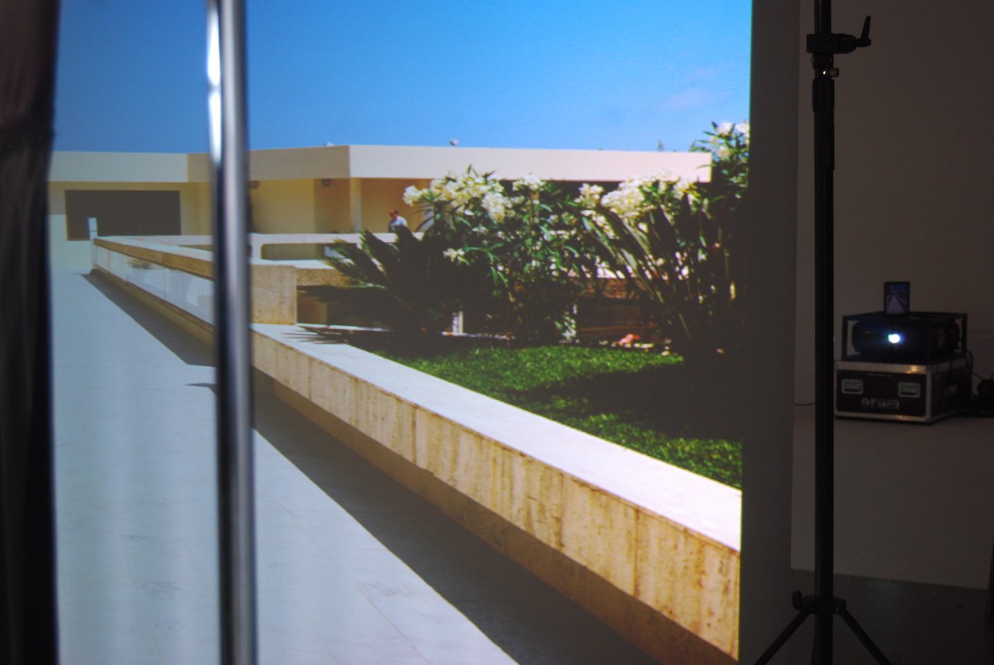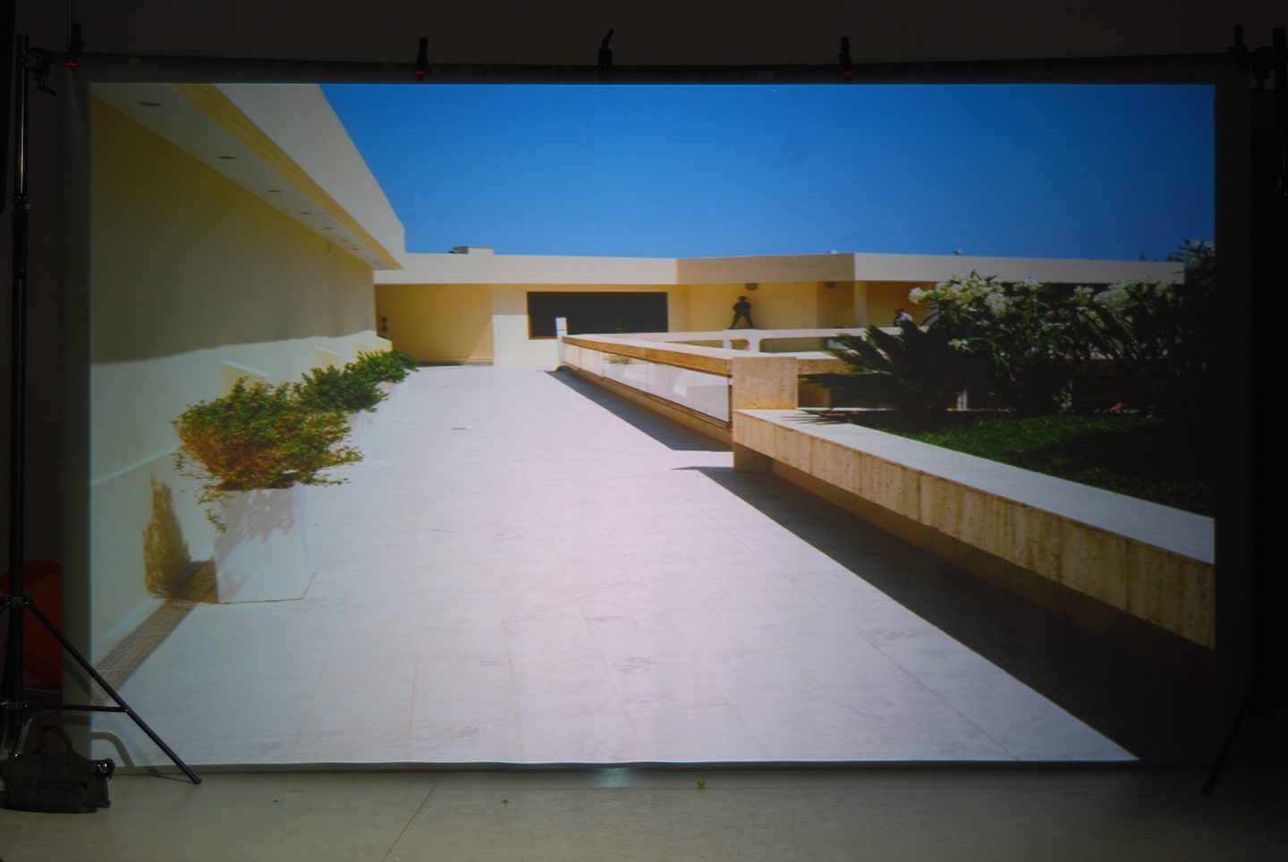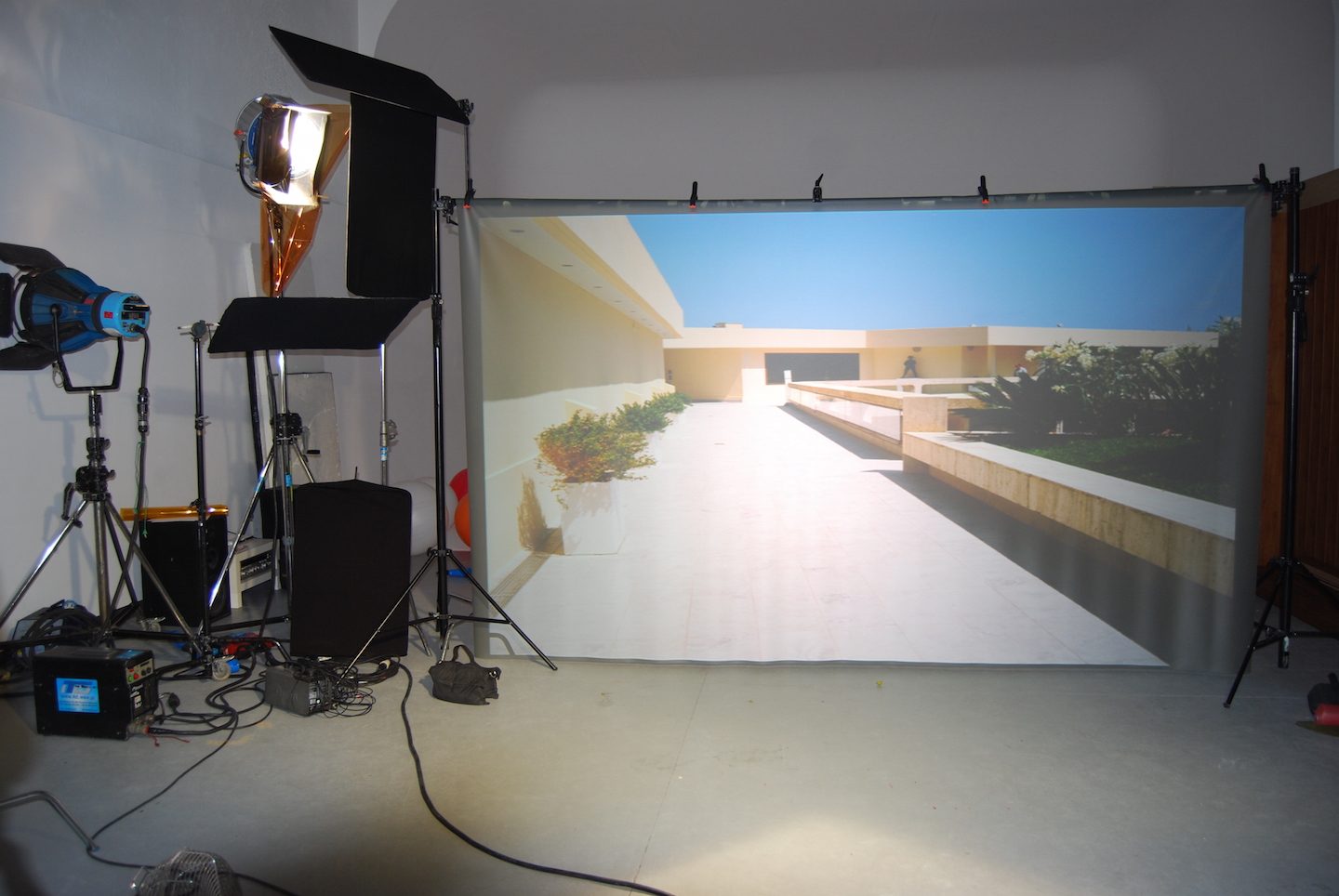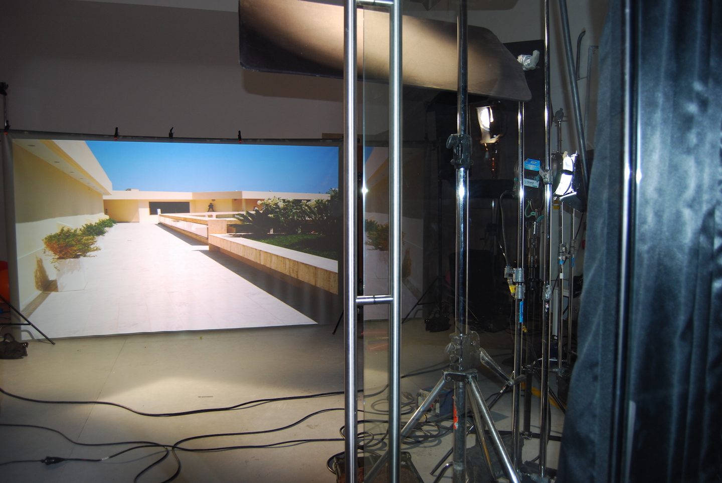 Montaż ekranu tylnej projekcji z projektorem, zapewniający realistyczne tło wideo w czasie rzeczywistym.